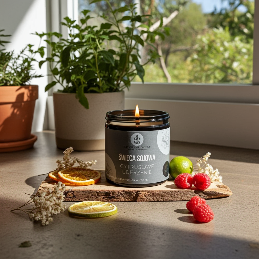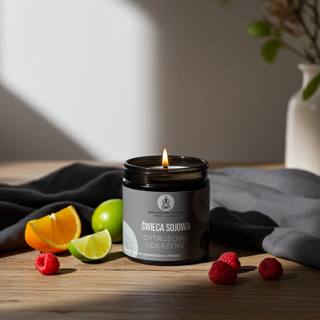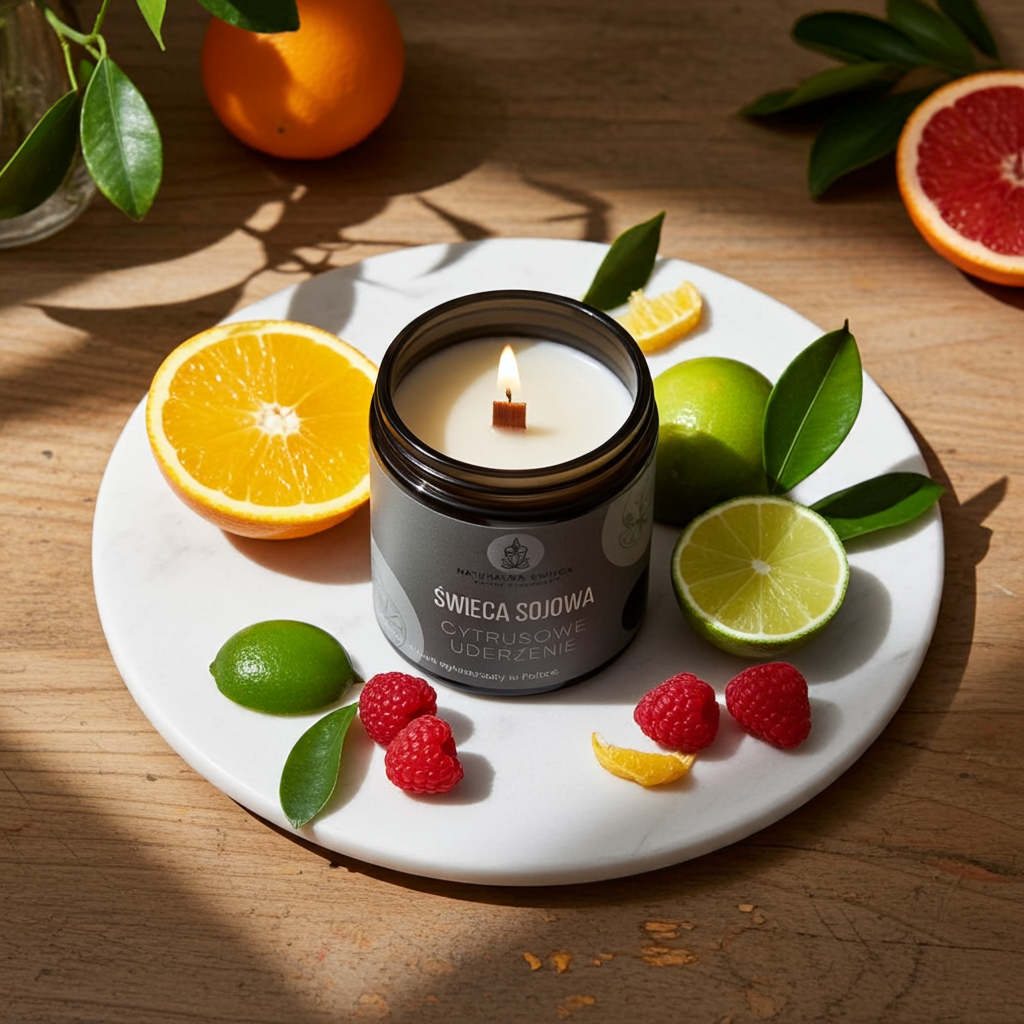 Sojawachskerze (120 ml) mit einem erfrischenden Zitrusduft aus brasilianischer Orange, persischer Limette, Himbeere, Birne und Rohrzucker. Holzdocht, natürliches Sojawachs und umweltfreundliche Zutaten für eine lange Brenndauer und eine besondere Atmosphäre.